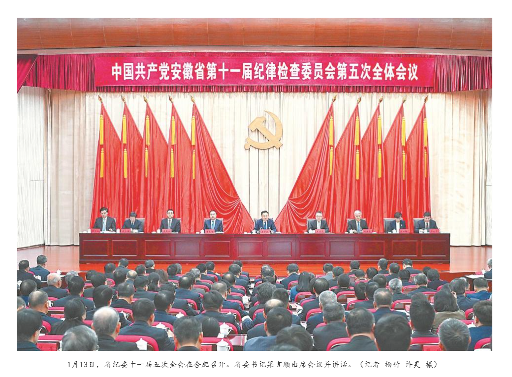1月13日,省紀(jì)委十一屆五次全會在合肥召開。省委書記梁言順出席會議并講話。他強調(diào),要深入學(xué)習(xí)貫徹習(xí)近平總書記關(guān)于黨的建設(shè)的重要思想、關(guān)于黨的自我革命的重要思想,認(rèn)真落實二十屆中央紀(jì)委四次全會和總書記考察安徽重要講話精神,深刻領(lǐng)悟“兩個確立”的決定性意義、堅決做到“兩個維護(hù)”,堅持用改革精神和嚴(yán)的標(biāo)準(zhǔn)管黨治黨,為譜寫中國式現(xiàn)代化安徽篇章提供堅強保障。