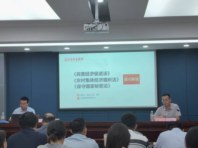 為深入貫徹落實(shí)黨的二十大關(guān)于“堅(jiān)持全面依法治國(guó)”的戰(zhàn)略部署,全面推進(jìn)國(guó)有企業(yè)合規(guī)管理體系建設(shè),切實(shí)將法治思維融入集團(tuán)改革發(fā)展大局,2025年6月20日下午,銅陵金誠(chéng)投資集團(tuán)在三樓大會(huì)議室組織開(kāi)展“新法新規(guī)專題學(xué)習(xí)培訓(xùn)會(huì)”。集團(tuán)副總經(jīng)理戴力主持會(huì)議,集團(tuán)法律顧問(wèn)、安徽通聞律師事務(wù)所主任陳磊律師受邀作專題授課,集團(tuán)及權(quán)屬公司負(fù)責(zé)人及業(yè)務(wù)骨干等40余人參加培訓(xùn)。