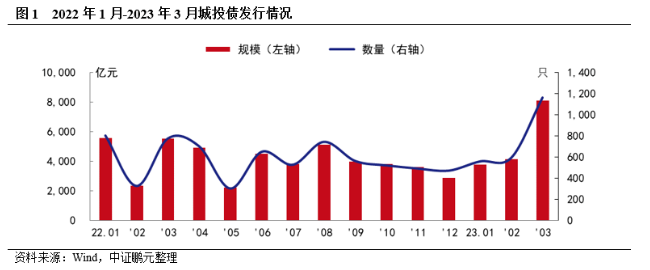 2023年3月份,各品種城投債共發(fā)行1,166只,發(fā)行規(guī)模8,118.42億元,發(fā)行數(shù)量同比增長50%、發(fā)行規(guī)模同比增長46%,環(huán)比分別增長96%和97%。綜合2023年1-3月,各品種城投債共發(fā)行2,319只,發(fā)行規(guī)模1.60萬億元,累計同比分別增長22%和19%。自2021年下半年以來,城投債融資政策處于收緊狀態(tài),發(fā)行規(guī)模呈現(xiàn)下降趨勢,3月份超過8000億元的發(fā)行規(guī)模為近5年來最高單月發(fā)行水平,主要因2023年3-4月份城投債進(jìn)入歷史償債高峰,借新還舊需求帶動發(fā)行規(guī)模大增。