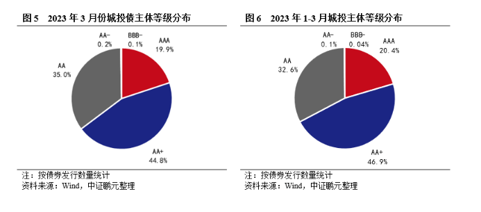 2023年3月份,城投債發(fā)行主體AA+級以上級別合計占比達(dá)到64.8%,較上月下降8.3pct。具體看,AAA主體發(fā)債232只,占比19.9%,較上月下降1.7pct;AA+主體發(fā)債522只,占比44.8%,較上月下降6.6pct;AA主體發(fā)債407只,占比35.0%,較上月上升8.1pct;3月份,仍有3只AA-級及以下主體債券,占比0.3%。