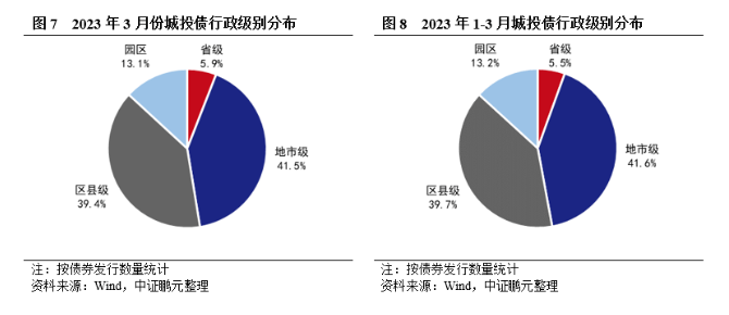 從行政級別分布來看,3月份區(qū)縣級城投平臺和園區(qū)平臺的債券發(fā)行數(shù)量占比上升。具體而言,省級平臺發(fā)行414只,占比5.9%,較上月基本持平;地市級平臺發(fā)行債券483只,占比41.5%,較上月下降1.6pct;區(qū)縣級平臺發(fā)行債券459只,占比39.4%,較上月上升1.0pct;園區(qū)城投發(fā)行債券153只,占比13.1%,較去年上月上升0.6pct。