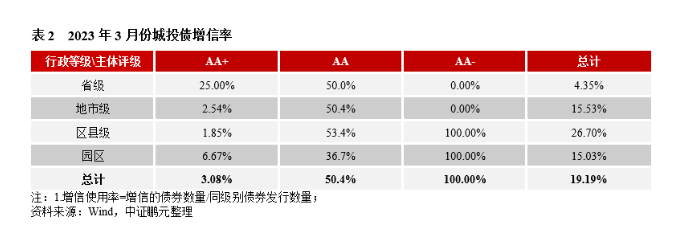 綜合2023年1-3月份,城投債總體增信使用率16.3%。AA+、AA級平臺的增信使用率分別為2.5%和46.0%,其中AA級地市級平臺增信使用率為42.4%、AA級區(qū)縣級平臺增信使用率為50.6%,AA級園區(qū)平臺增信使用率為35.2%;增信效果上,1-3月份共有184只債券通過增信使債項等級得到提升,占發(fā)行數(shù)量的7.9%。