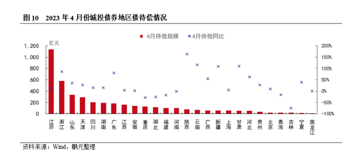2023年4月份,有29個省城投債待償,待償規(guī)模4,237.80億元(不含未宣告的回售規(guī)模),同比增長20%、環(huán)比下降24%。待償規(guī)模靠前地區(qū)有:江蘇城投債待償規(guī)模1,135.55億元,同比增長13%,環(huán)比下降17%;浙江城投債待償規(guī)模580.28億元,同比增長86%、環(huán)比下降16%;山東城投債待償規(guī)模336.10億元,同比增長36%、環(huán)比增長21%;天津城投債待償規(guī)模291.55億元,同比增長28%、環(huán)比增長24%;四川城投債待償規(guī)模206.44億元,同比增長16%、環(huán)比下降31%。待償規(guī)模100億元以上的地區(qū)找那個,浙江、廣東、山東同比增長較大。