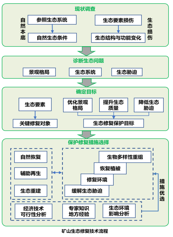 在保障地質安全基礎上,根據不同場地的破壞特點,采取自然恢復為主、人工修復為輔的修復方式,通過地貌重塑、土壤重構、植被重建、污染防治、生物多樣性保護等措施,修復受損的生態結構與生態功能,實現安全穩定與景觀協調。