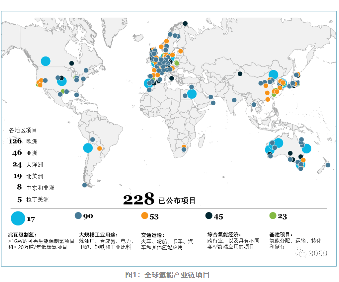 根據(jù)國際氫能委員會統(tǒng)計,在全球范圍內(nèi),氫能產(chǎn)業(yè)鏈目前已有228個已建、在建及規(guī)劃項目(見圖1)。其中,有17個是已公開的兆瓦級綠氫生產(chǎn)項目(即>1GW可再生能源和>20萬噸/年的低碳氫產(chǎn)能項目),主要分布在歐洲、澳大利亞、亞洲、中東、智利等國家和地區(qū)。
