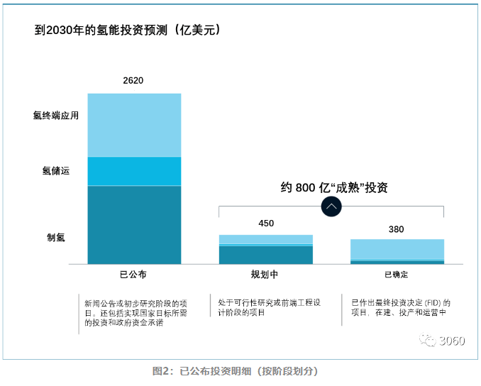 根據(jù)全球氫能項目公告、實現(xiàn)各國政府生產(chǎn)目標所需的投資、支出等數(shù)據(jù)預測,到2030年,全球氫能產(chǎn)業(yè)鏈的投資總量將超過3000億美元——相當于全球能源投資的1.4%。鑒于氫能產(chǎn)業(yè)仍處于早期發(fā)展階段,這些投資中的絕大多數(shù)(75%)未公布投資總額。預計到2030年全球?qū)⒂?00億美元的成熟投資,其中包括處于規(guī)劃階段的450億美元,和已承諾的項目或在建、已投產(chǎn)或已投入運營的項目380億美元(見圖2)。