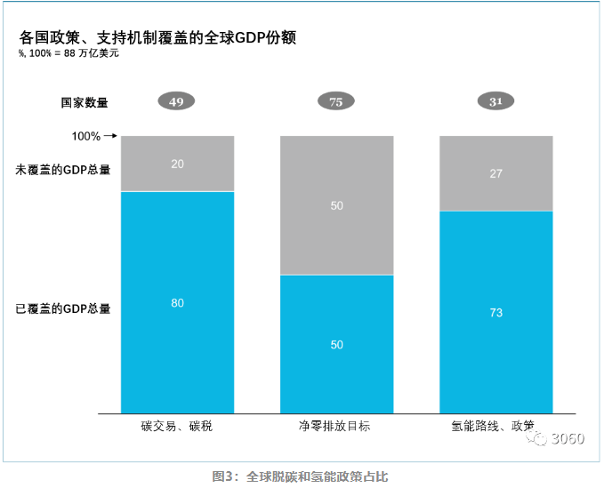 全球各國政府已投入總計約700億美元,用以支持氫能戰(zhàn)略。由于全球脫碳化進程的加快,越來越多的國家提出發(fā)展氫能:占世界GDP總量50%的75個國家已提出凈零排放目標,占世界GDP總量80%的國家出臺二氧化碳定價機制(見圖3)。