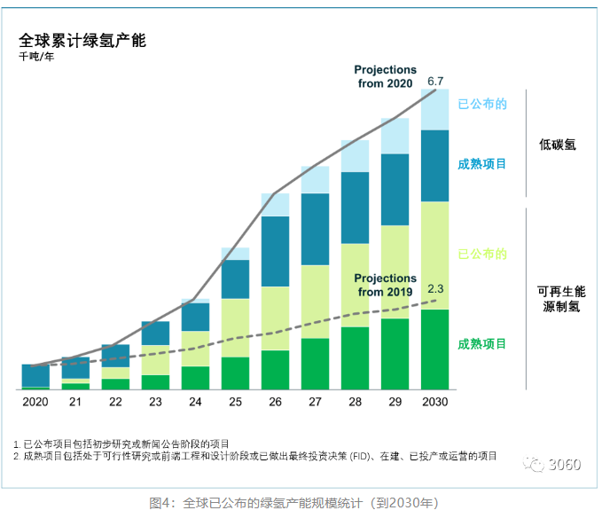 由于對氫能的日益關(guān)注和各國政府支持的增加,全球已公布的2030年綠氫的年產(chǎn)能從之前的230萬噸增加至670萬噸(見圖4)。