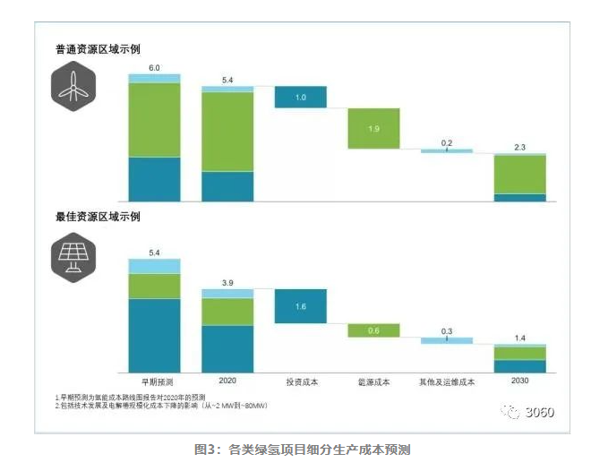 綜上所述,對比2020年國際氫能委員會的預測,以上這些因素將共同推動綠氫成本預測曲線在平均成本區(qū)間降低20%,在最佳成本區(qū)間降低30%。