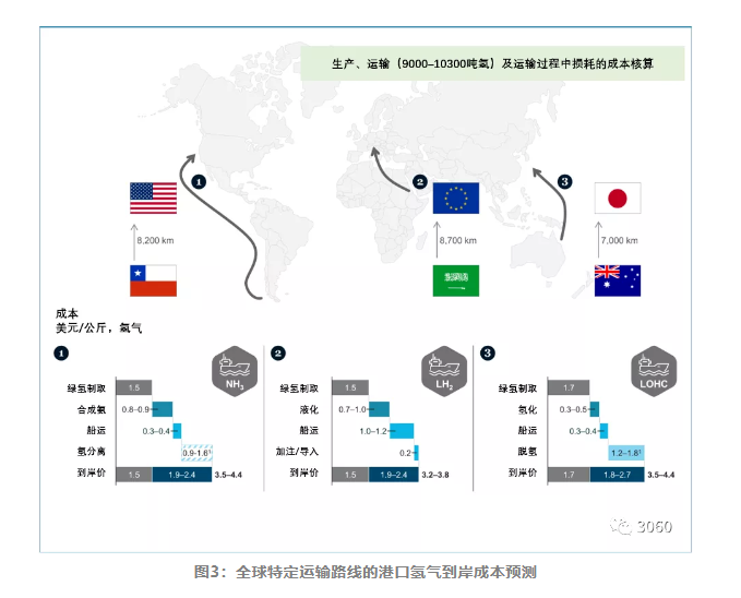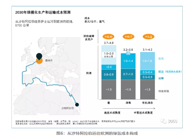 如果目的地需要液態(tài)或高純度氫氣,液氫儲運的效率最高。與氨和有機液態(tài)氫相比,液氫無需脫氫或裂解即可轉(zhuǎn)化為氫氣,不僅節(jié)省成本,且無需提純。液氫的主要缺點是體積能量密度相對較低,限制了船運的載氫量,同時儲運過程中會有蒸發(fā)損失。雖然液氫儲運是一種經(jīng)過驗證和商業(yè)化的技術(shù),但大規(guī)模液氫儲運仍處于試運營階段;氨擁有比液氫更高的體積能量密度,因此以氨的形式運輸比液氫儲運更具經(jīng)濟行。但氨后續(xù)裂解成氫的成本較高,且可分離的氫純度較低。此外,由于氨具有毒性,所以在特定區(qū)域會有儲運限制;液態(tài)有機儲氫可以應用現(xiàn)有的柴油基礎(chǔ)設(shè)施,長期安全儲存氫,且不會發(fā)生損耗。但LOHC的主要缺點是脫氫過程需要大量的熱量,且與液氫和氨相比載氫能力有限。(圖6預測了2030年從沙特阿拉伯向西歐運輸綠氫的三種儲運成本構(gòu)成情況,包括制氫成本,到岸價格在3-5美元/公斤。)