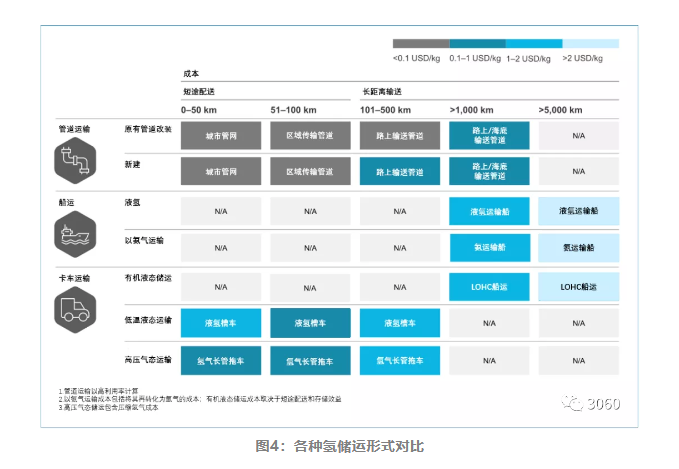 對于長距離運輸,應用新建或改造后的海底輸氫管道進行大規(guī)模氫氣運輸,成本比航運更具經(jīng)濟性,但并非適用于所有國家和地區(qū)。在沒有管道的情況下,目前主要以液氫、LOHC和氨的形式儲存,并以船實現(xiàn)遠距離運輸。同時由于三種形態(tài)的儲運成本差距較小,因此最佳儲運方式取決于目的地的終端應用形式、氫氣純度和壓力水平等因素(見圖4)。