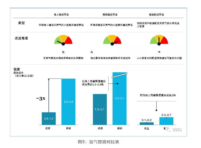 根據(jù)目前的項目來看,陸上氫氣管道的改造成本約為60-120萬美元/公里,新建管道成本約為220-450萬美元/公里;對于海上/海底氫氣管道,根據(jù)新建或改造的具體條件和建設(shè)難度,成本要比陸上管道高出1.3到2.3倍;而短途配送管道由于其較小的管徑和較低的壓力要求,建設(shè)和改造成本比傳輸管道便宜得多(大約只占傳輸管道成本的15%),但只有未來住宅和商業(yè)建筑對氫氣的需求超過天然氣摻氫臨界值(20%)的情況下,短途配送管道的大規(guī)模建設(shè)才具有經(jīng)濟性。(見圖5)