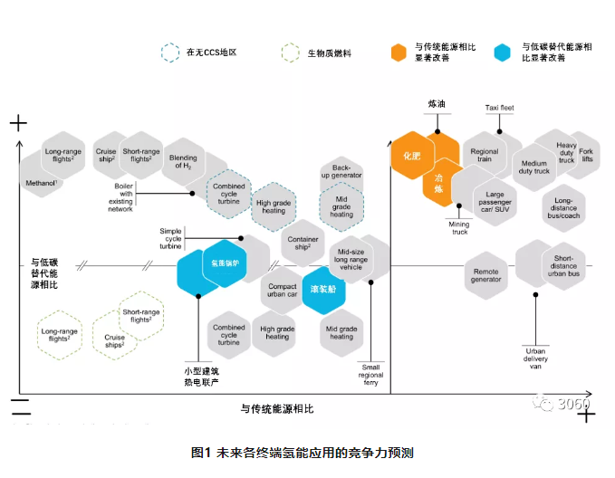 在國際氫能委員會(Hydrogen Council)在《氫能洞察》報告中,梳理預測了未來各領(lǐng)域氫能應用與傳統(tǒng)能源和低碳替代能源的競爭力對比。從總體擁有成本(TCO)的角度來看,在全球制氫、儲運、配送成本快速下降的趨勢下,氫能在各領(lǐng)域的應用潛力將逐步凸顯,到2030年,氫能可在22種終端應用中成為最具競爭力的減碳解決方案,包括煉油、化肥、商用車、長途卡車運輸、航運和氫冶煉等應用領(lǐng)域。(見圖1)。