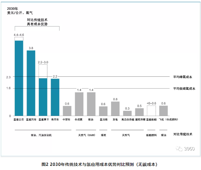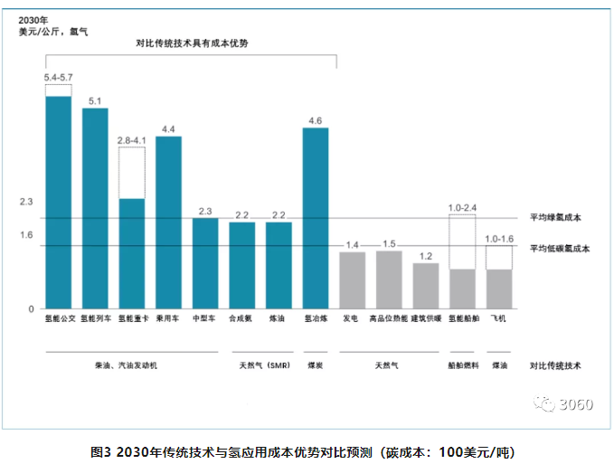 根據(jù)2030年各領(lǐng)域中傳統(tǒng)技術(shù)與氫應用成本對比預測(見圖2),可以看到,以1.6-2.3美元/千克的氫能終端應用成本計算,在不考慮碳排成本的情況下,氫能僅在大型公路運輸應用(不包括乘用車)方面具有競爭力。若增加各領(lǐng)域碳排放成本(以100美元/噸CO2計算),氫能將在大多數(shù)道路運輸和工業(yè)應用中具有顯著的成本優(yōu)勢(見圖3)。