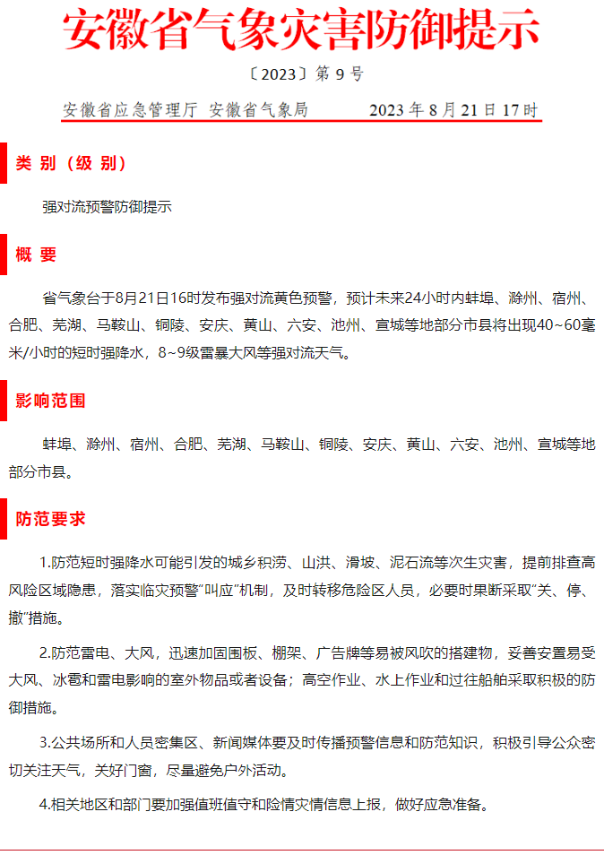 安徽省氣象臺2023年08月21日16時發布強對流黃色預警