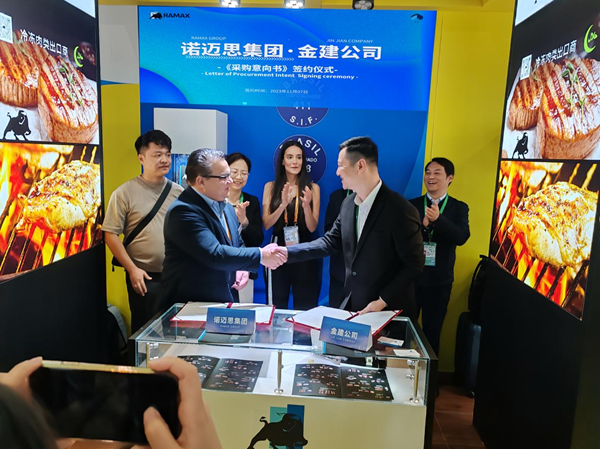 11月7日上午,第六屆進博會巴西展區,在市政府副市長汪發進、市商務局局長張瓊、郊區政法委書記翟剛,中基商貿(浙江)有限公司總經理史偉的見證下,金建公司與巴西Ramax集團簽訂了采購牛肉意向合同。合同的簽訂標志著金建公司進一步融入國際供應鏈市場,加強長三角區域內企業間合作,打造新的共同發展模式。