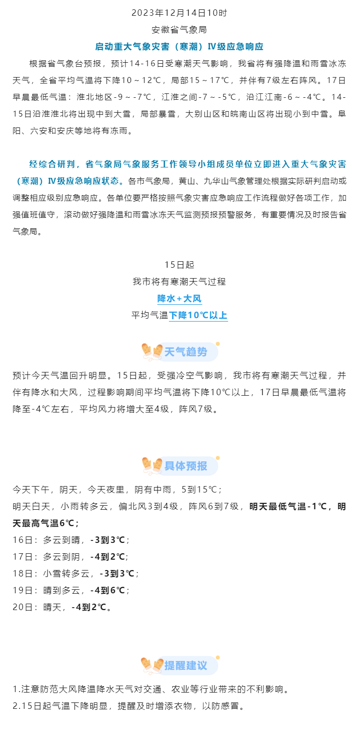 安徽啟動寒潮Ⅳ級應(yīng)急響應(yīng)!銅陵將暴跌10℃……
