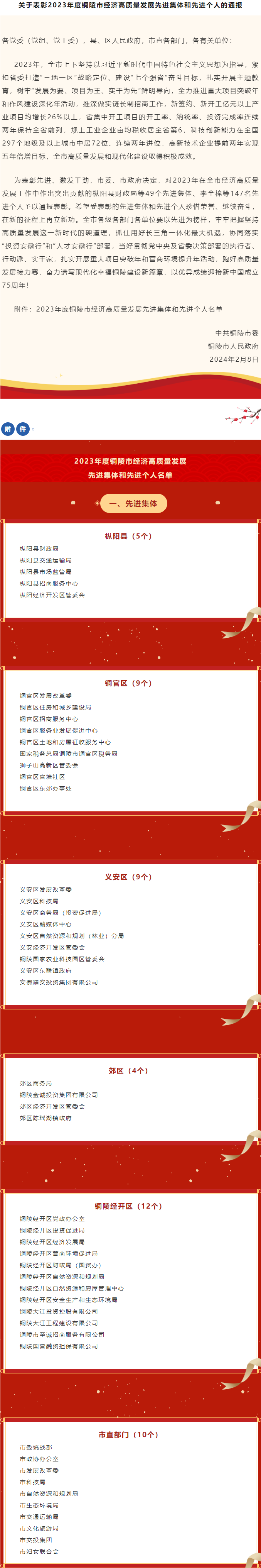 轉(zhuǎn)載:中共銅陵市委 銅陵市人民政府 關(guān)于表彰2023年度銅陵市經(jīng)濟(jì)高質(zhì)量發(fā)展先進(jìn)集體和先進(jìn)個(gè)人的通報(bào)